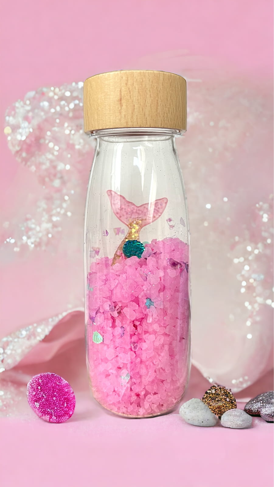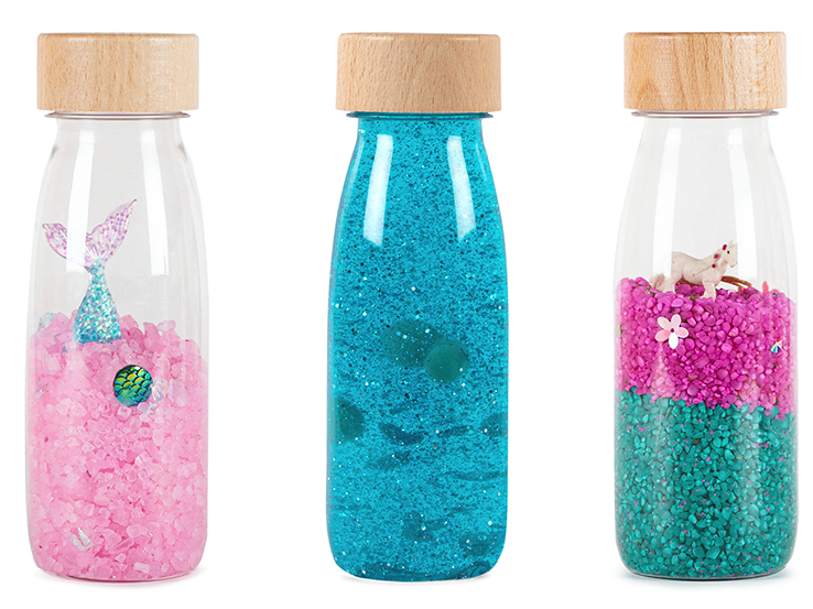 Butelki sensoryczne od Petit Boum to kolorowy świat zamknięty w niewielkiej, przystępnej dla dziecka formie. Bawią, uczą i stymulują wyobraźnię! Pozwól swojemu dziecku poruszać, potrząsać i manipulować butelką, aby odkrywać kolory i figurki tematyczne zamknięte w butelce. Różnorodna zawartość butelek pozwala odkrywać nowe, ciekawe dźwięki charakterystyczne dla ukrytych w butelce elementów. Zabawa butelką od Petit Boum rozwija zmysły i wyobraźnię dziecka! Czy rozpoznasz butelki po ich dźwiękach? Czy znajdziesz w środku syrenę lub jednorożca? :)