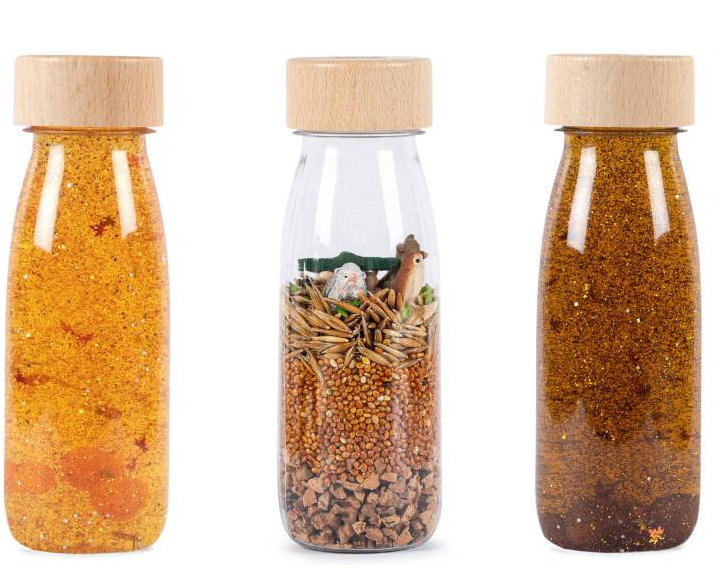 Zestaw składa się z 3 butelek sensorycznych: Float - Kurkuma, obserwacyjnej - Las oraz Float w kolorze ciepłego brązu (SIENA) .